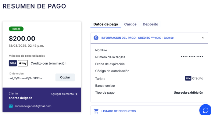 Las transacciones realizadas mediante Apple Pay se mostrarán en la sección de pagos de la misma manera que las transacciones regulares. Sin embargo, para facilitar la identificación de estos pagos, en la sección "Resumen de pago" aparecerá el logotipo de Apple Pay:
