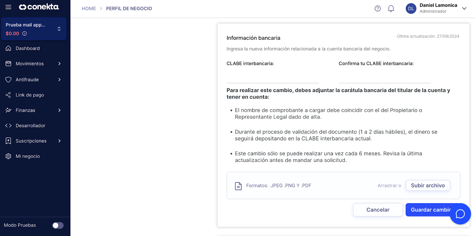 Al dar clic te desplegará una ventana, en donde deberás ingresar el nuevo número de cuenta clabe y adjuntar la carátula bancaria.