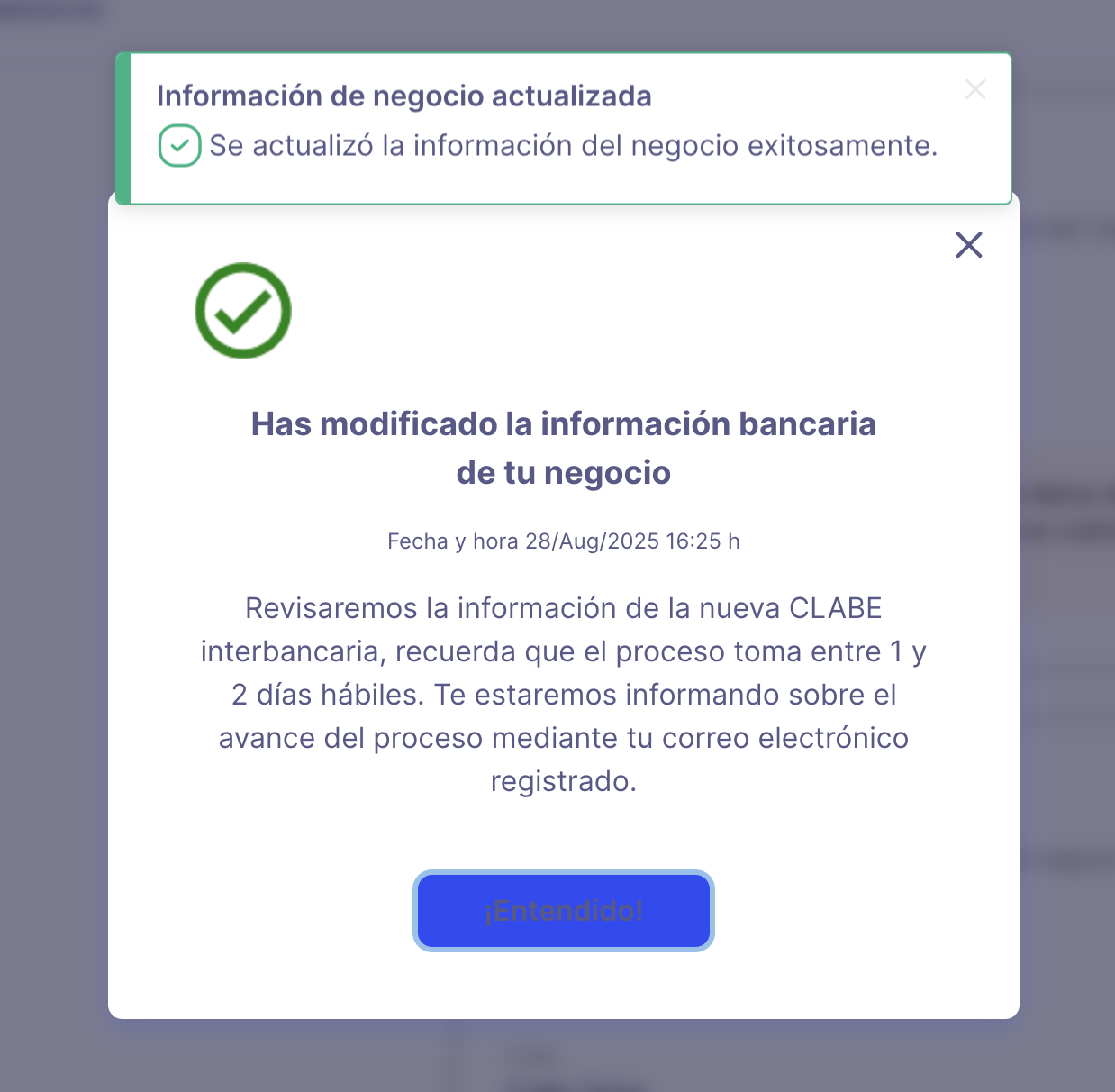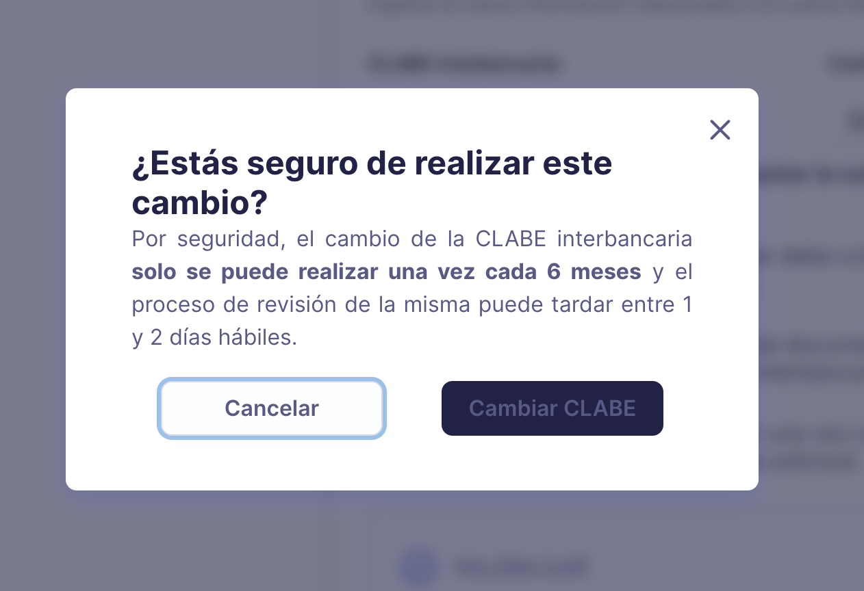 Al presionar el botón Cambiar CLABE, te llegará una notificación de solicitud exitosa. El avance del cambio, se te estará informando a través de tu correo electrónico.