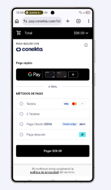 Si ya tienes habilitado el método de pago con tarjeta, Google Pay puede aparecer automáticamente como opción en algunos flujos, como Link de pago y Checkout redireccionado. Consulta nuestro dev center para mas detalles.